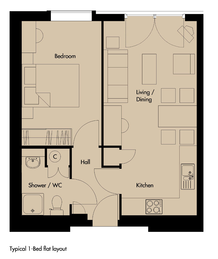 One bedroom flats consist of a double bedroom, shower room (no bath), kitchen area open to the sitting room. There is no washing machine in the flat, but there are separate laundry facilities onsite. All tenants at the West Cambridge site are able to use the onsite laundry facilities. University WiFi is provided within these properties. [view sample floorplan]