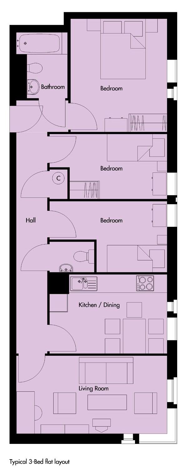 Three bedroom flats comprise a double bedroom and two single bedrooms, but have an extra separate toilet and also space and plumbing for a washing machine. One car parking space can be applied for. [view sample floorplan]